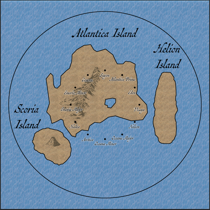 But everything begins with the birthmark. Even Lake Atlantica, near the center of the island, falls within the peninsula formed by the original shape. The invisible Helioshield, which hides the islands from outside detection, radiates from the center of the main island, Atlantica Island.