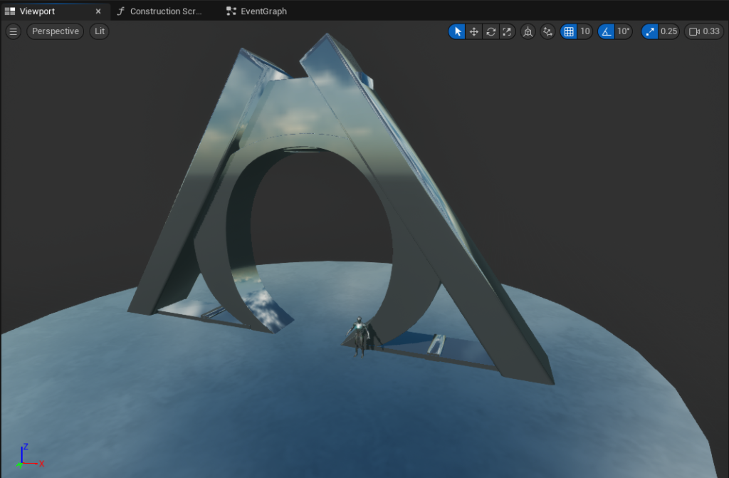 The stellargate you see here is a first-pass blockout in Unreal Engine 5: an A-frame silhouette with a circular entrance, placed on a low, reflective plaza for scale tests. The model shares proportions with the off-world versions so silhouette language stays consistent across the Atlantica System.
